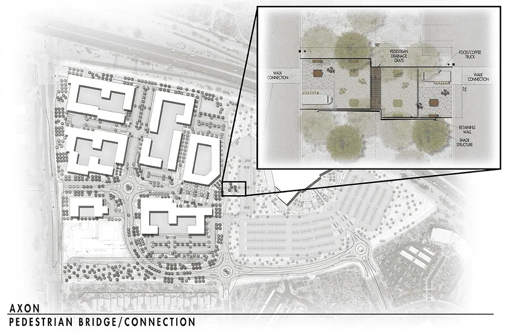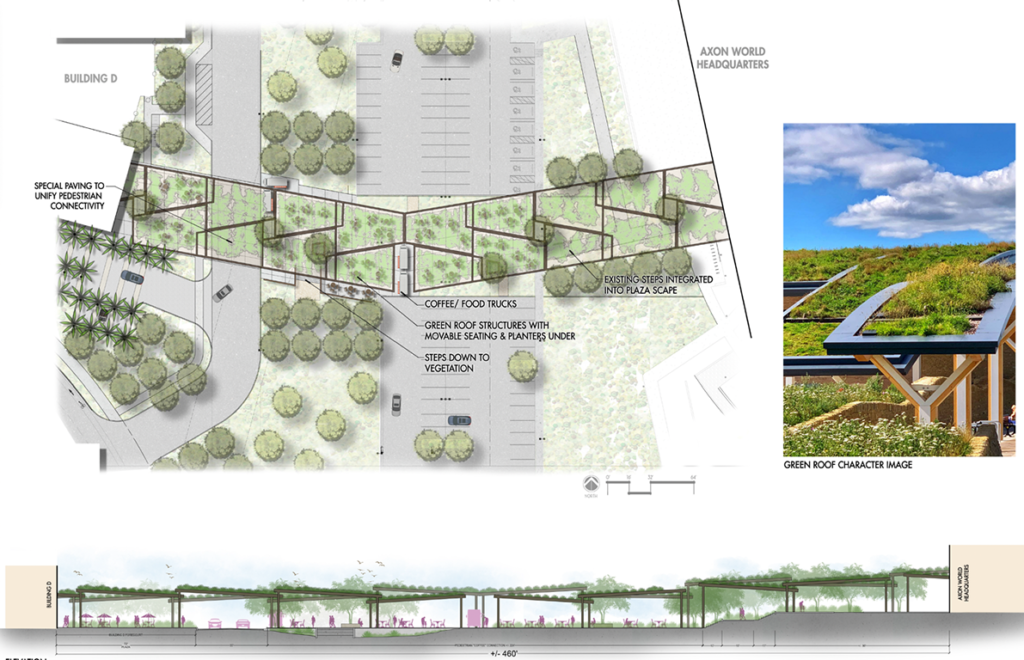 “Phase one of the project will include completion of the East Axon Way improvements and the roundabout. Site design includes strong pedestrian connectivity between the headquarters building and the mixed-use component and a publicly accessible multi-use path that will run along the entire perimeter of the site.”