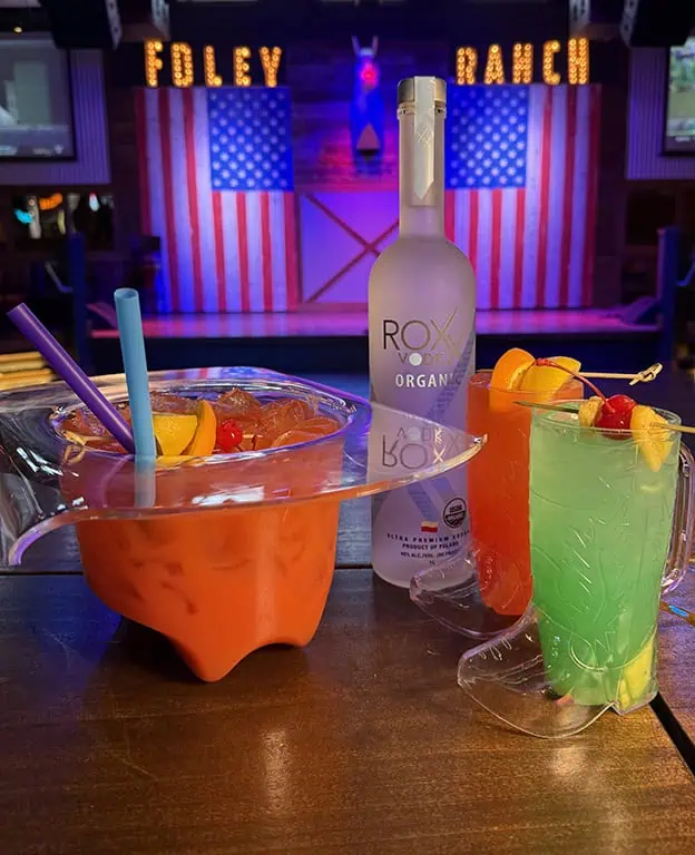 - Cowboy Blues ($10) with Roxx premium vodka, blue curacao, pineapple, and sprite in a 16-ounce cowboy boot. This drink can be made into a team event with Foley Ranch’s four-person cowboy hat cocktail ($40).